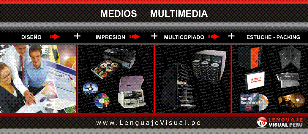LENGUAJE VISUAL PERÚ se ha enfocado en estar a la vanguardia con lo último en tecnología Digital. La grabación e impresión de CDs y DVDs tiene muchos usos en el mercado. Se utiliza principalmente para presentaciones institucionales, publicidad, marketing corporativo, catálogos, películas, libros electrónicos, música, etc. Nuestros Diseñadores Gráficos elaborarán las portadas de sus CD-DVD, pasando luego a las máquinas Impresoras en calidad fotográfica, luego nuestras torres de Muticopiado grabarán la información en el disco y por último le ofrecemos una gran variedad de Estuches y también Packing elaborados al pedido exclusivo de nuestros clientes. LENGUAJE VISUAL PERÚ le ofrece productos de alta calidad a precios muy competitivos en tiempos realmente destacables.